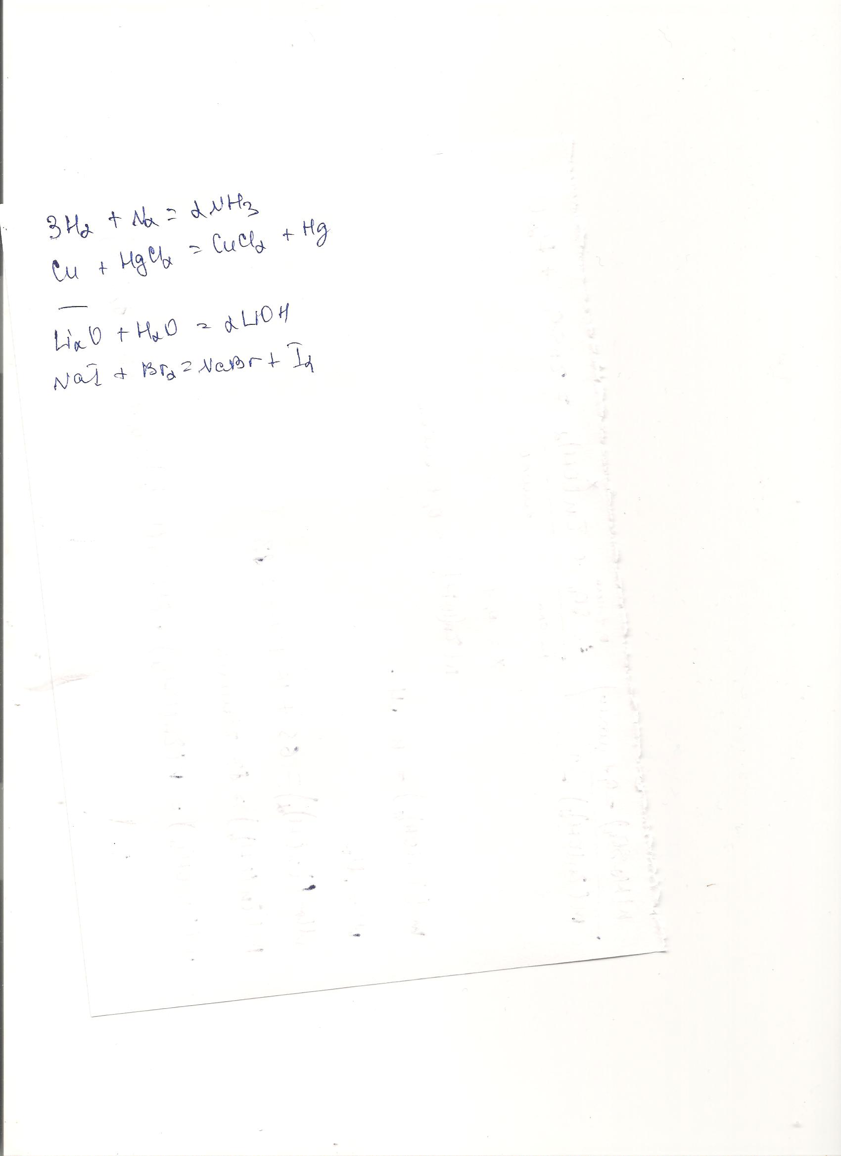 H2+N2=H3,,,,Cu+HgCL2=CuCL+Hg,,,HOCL=HCLO2,,,Li2O+H2O=LiOH,,,Nai+Br2=NaBr+i2