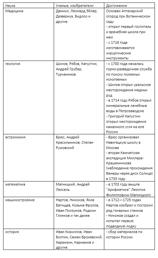 таблица по теме изменение в культуре и быте в первой четверти 18 века Таблица делися на 3 столбца. наука ученые изобретения достижения