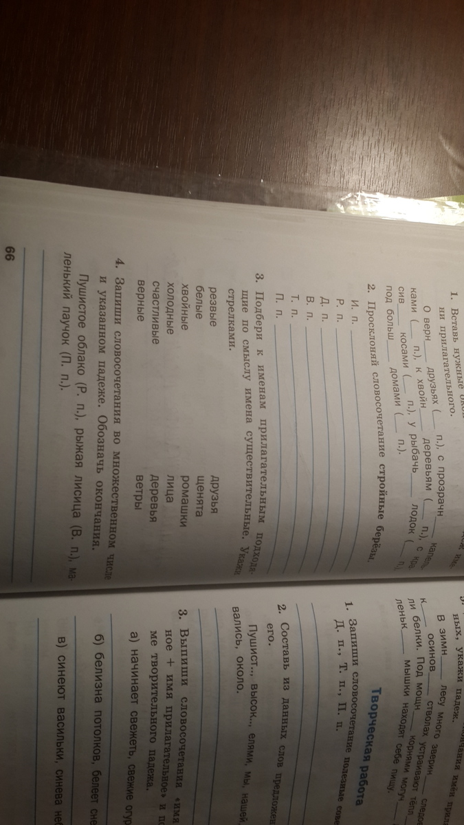 1. О верных друзьях (Пр. п), С прозрачными капельками (Тв. п), к хвойным деревьям (Дат.п), с красивыми носами (Тв.п), у рыбачьих лодок (Род.п), под большими домами (Тв.п)