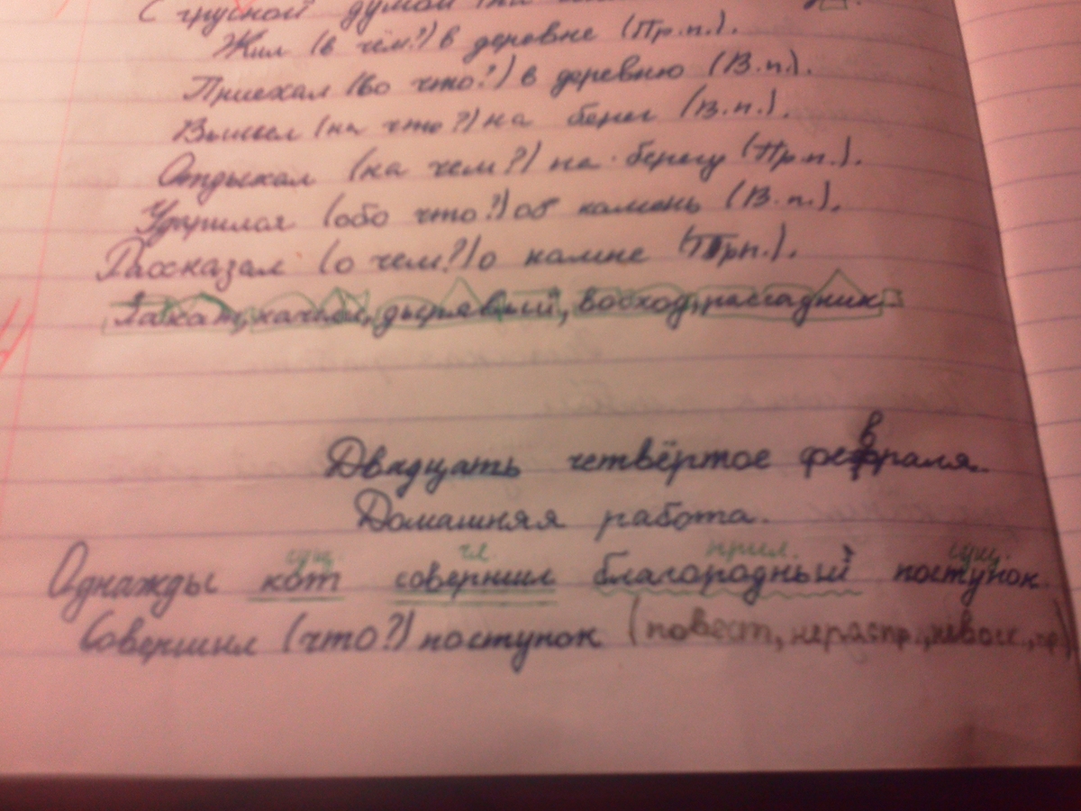 Однажды (наречие _._._) кот (сущ.) совершил (глагол =) благородный (прилаг. ~) поступок (сущ. _ _ _).