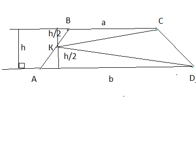S(Δ KCD)=S( трапеции) -S (Δ KBC) -S (Δ AKD)=(a+b)·h/2 - (a+b)·h/4= (a+b)·h/4