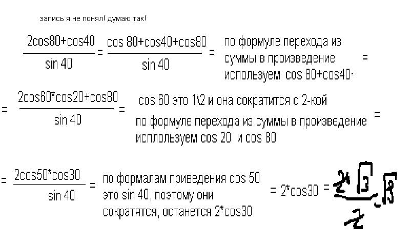 (2 cos80° + cos40°) / sin40° = √3 (синус общий знаменатель)