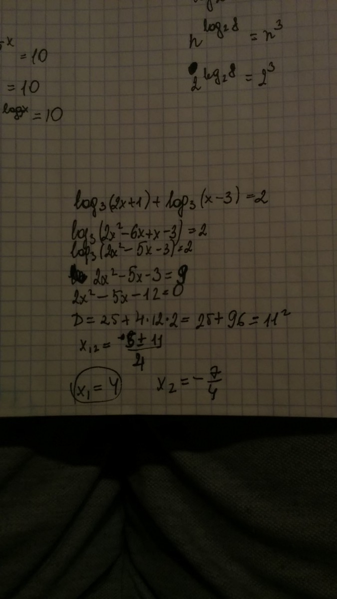 Второй корень не подходит, т.к. подлогарифмическое выражение во втором логарифме становится отрицательным.