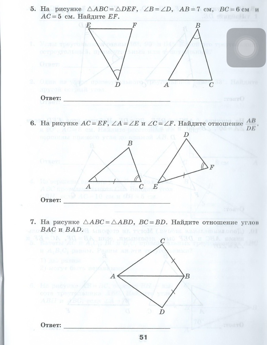 5. Треугольники по условию равны, осталось выяснить соответствующий элемент, в 1 треугольнике против угла D лежит EF, а во 2 - против угла B лежит AC. Следовательно, EF=AC=5 (cм)