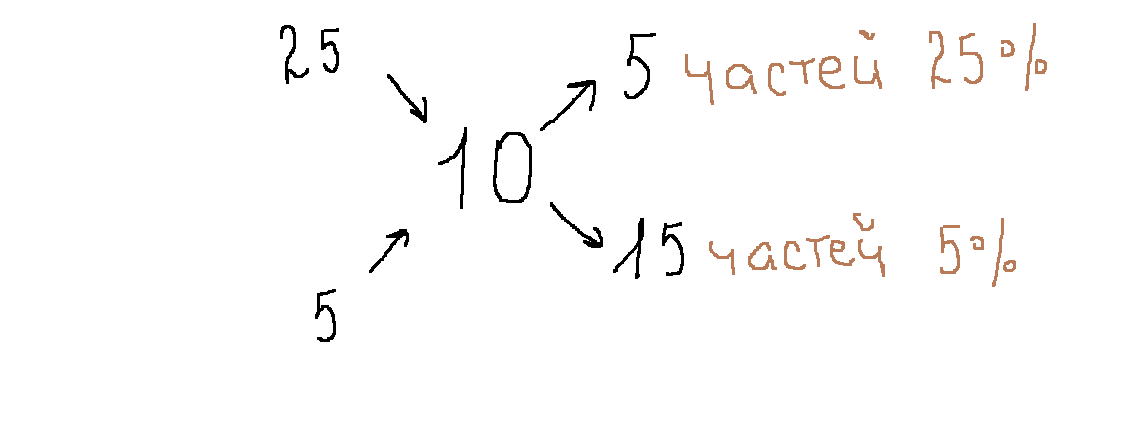 Используя метод крестов (на рисунке) видим что для приготовления 10 % раствора нам надо использовать 5 частей 25% раствора и 15 частей 5 %.