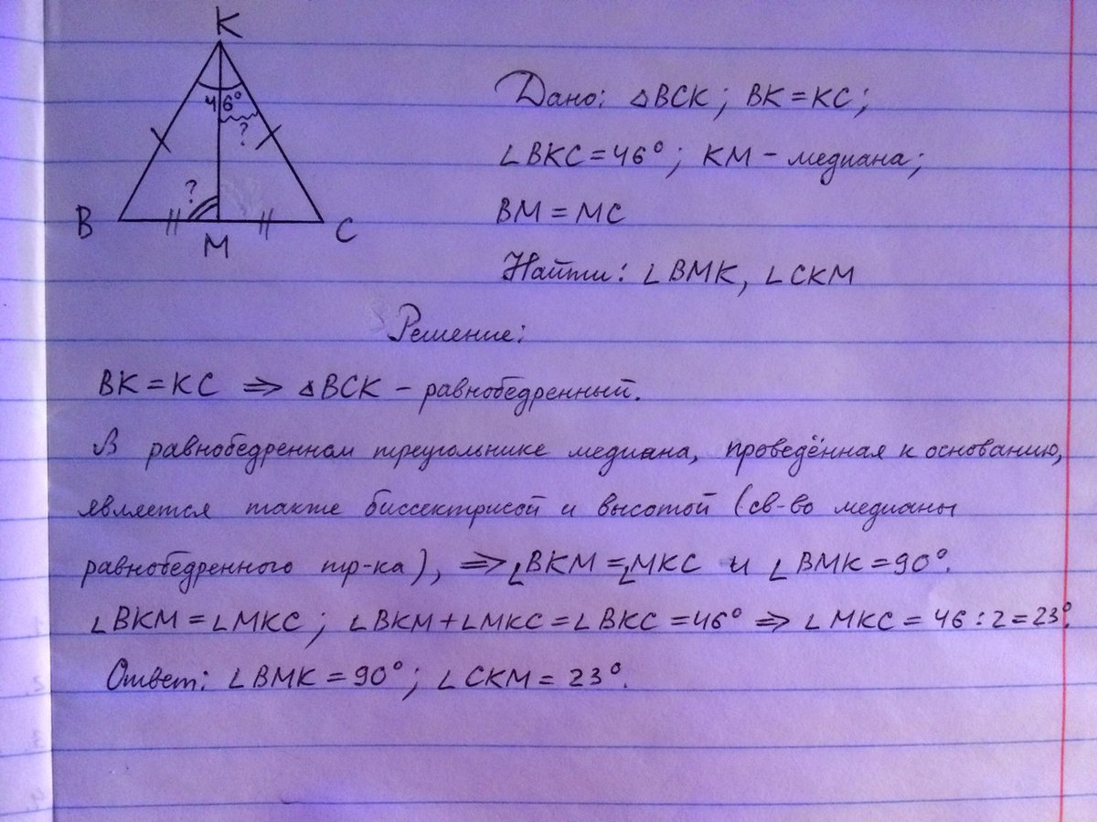 Помогите пожалуйста(геометрия).В треугольнике BCK стороны BK и CK равны,KM - медиана,угол BKC=46 градусов.Найдите углы BMK и CKM.
