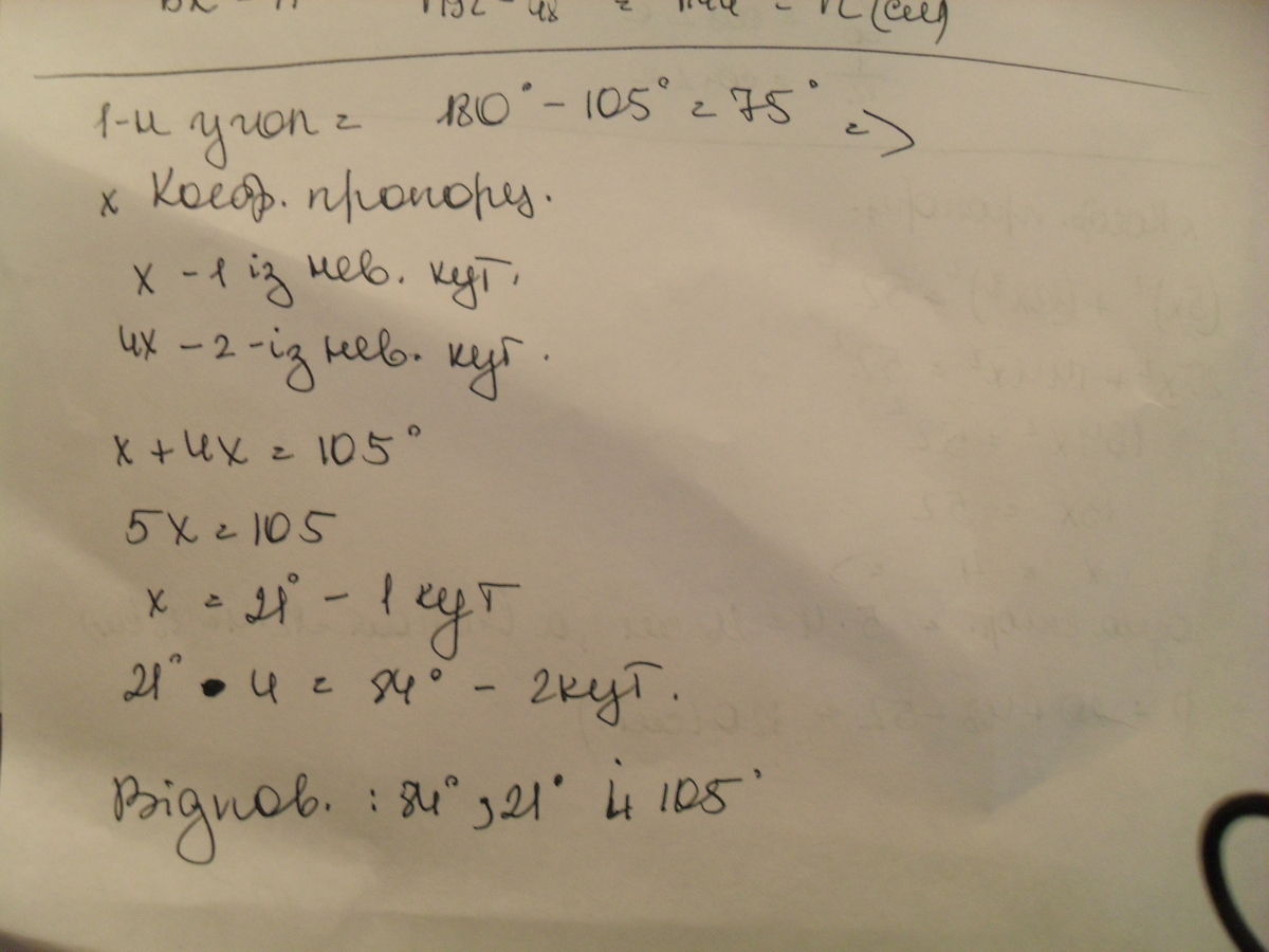 Один із кутів трикутника в 4 рази більший за другий , а зовнішній кут третього кута дорівнює 105. Знайдіть кути трикутника Пожайлуста очень надо . Спасибо