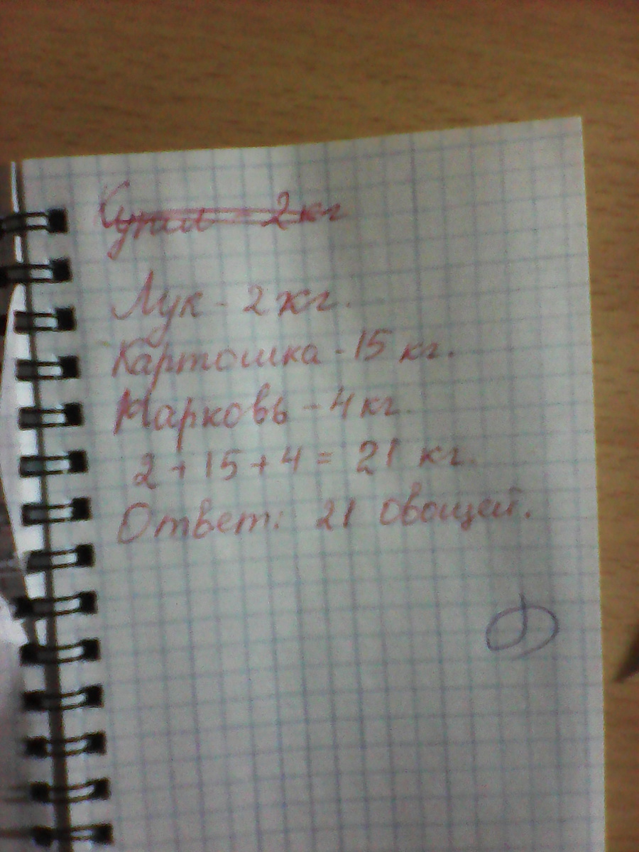 Прочитай задачу.Запиши решение и ответ задачи.Папа купил 2 кг лука,и 15 кг картошки и 4 кг моркови.Сколько всего овощей купил папа?