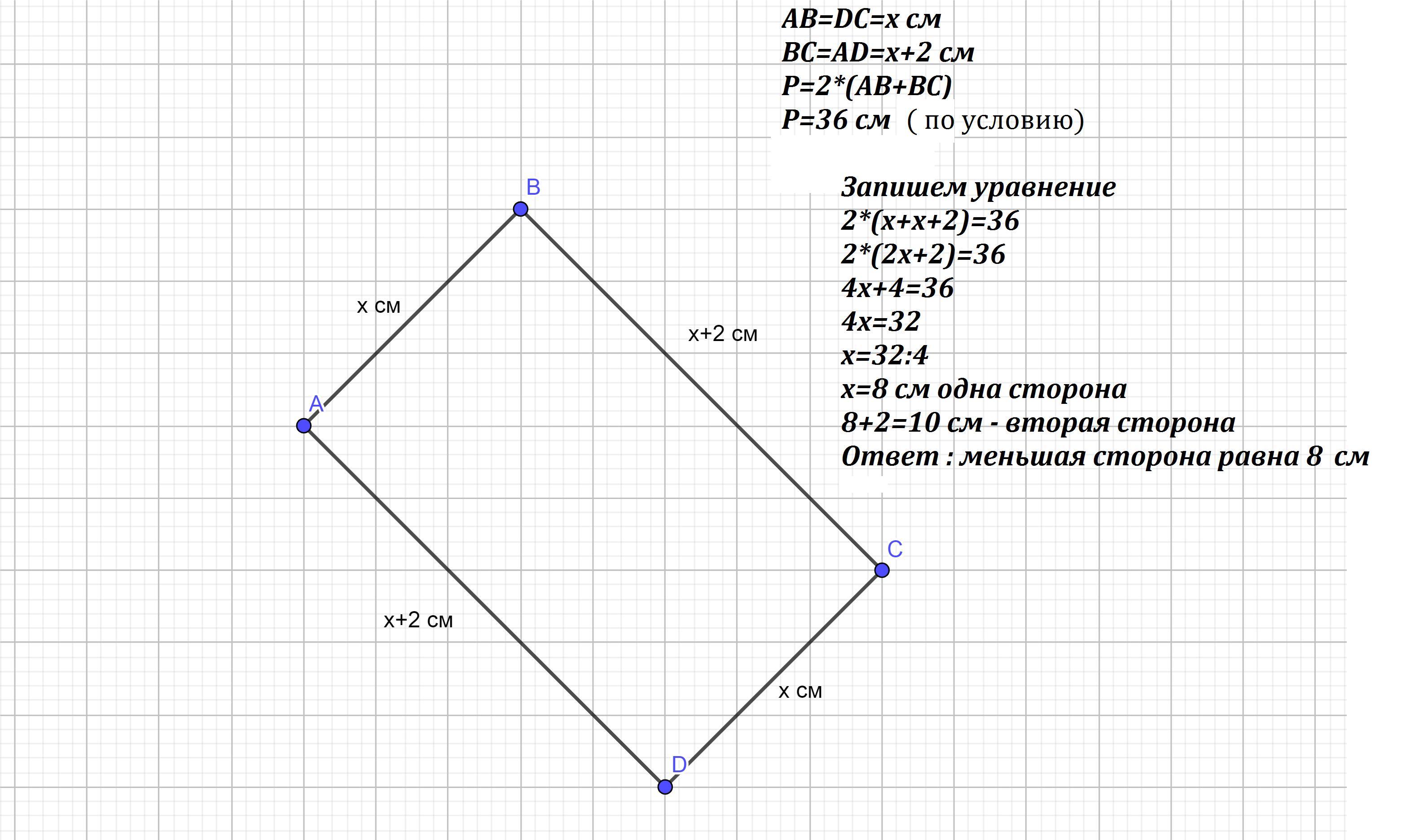 наименьшую сторону данного четырехуголтника если одна сторона на 2 см больше другого а его пириметр равен 36 см