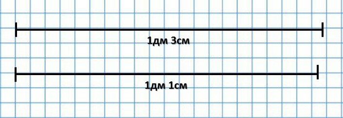 2 класс. Начерти отрезки длиной 1 дм 3 см и 1 дм 1 см. Запиши сумму длин и разность длин этих отрезок. Найди их значение.