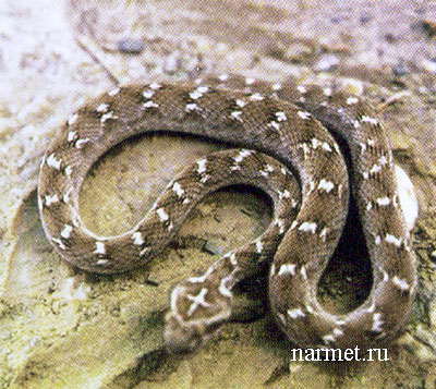 Это эфа . Эфе характерен золотисто-песчаный окрас, при этом вдоль всего тела располагаются достаточно крупные пятна белого цвета, а с боку вычерчен светлый зигзаг. Так называемый крест находиться на голове эфы.