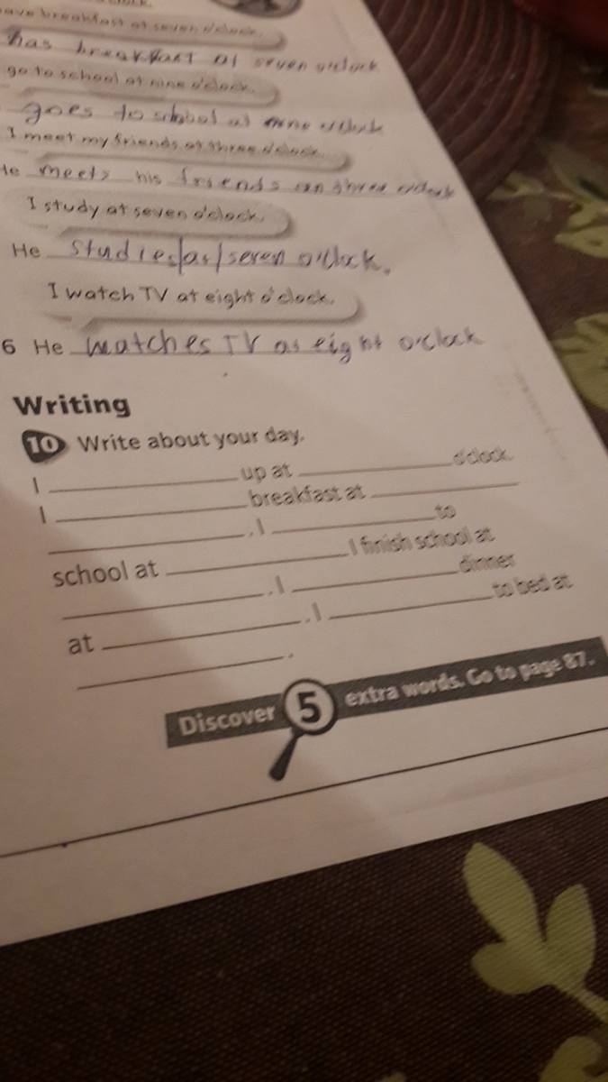 I get up at 7 o clock. I have breakfast at 7:15 o clock.I go to school at 7:45 o clock. I finish school at 1 pm. I have dinner at 6 pm. I go to bed at 10 pm/