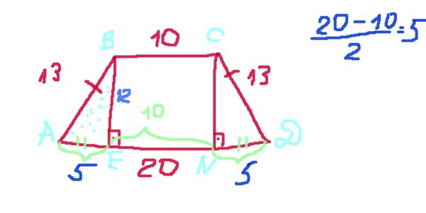 высота= 13²- (20 - 10 / 2)²=169-25= корень из 144=12 по теореме Пифагора
