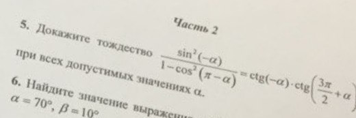 frac{sin^2(- alpha )}{1-cos^2(pi - alpha )} = ctg(- alpha )cdot ctg(frac{3pi }{2} + alpha )\\frac{sin^2(- alpha )}{1-cos^2(pi - alpha )}= frac{(-sin alpha )^2}{sin^2(pi - alpha )} = frac{sin^2 alpha }{sin^2 alpha } =1; ;\\ctg(- alpha )cdot ctg( frac{3pi }{2} + alpha )=-ctg alpha cdot (-tg alpha )=ctg alpha cdot tg alpha  =1; ;\\1=1\\oo