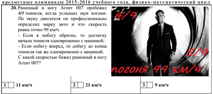Раненный в ногу Агент 007 пробежал 4/9 тоннеля, когда услышал звук погони. По звуку двигателя он профессионально определил марку авто и что скорость равна точно 99 кмч. - Если я побегу обратно, то достигну начала тоннеля одновременно с машиной; - Если побегу вперед, то добегу до конца тоннеля так же одновременно с машиной. С какой скоростью бежал раненный в ногу Агент 007?