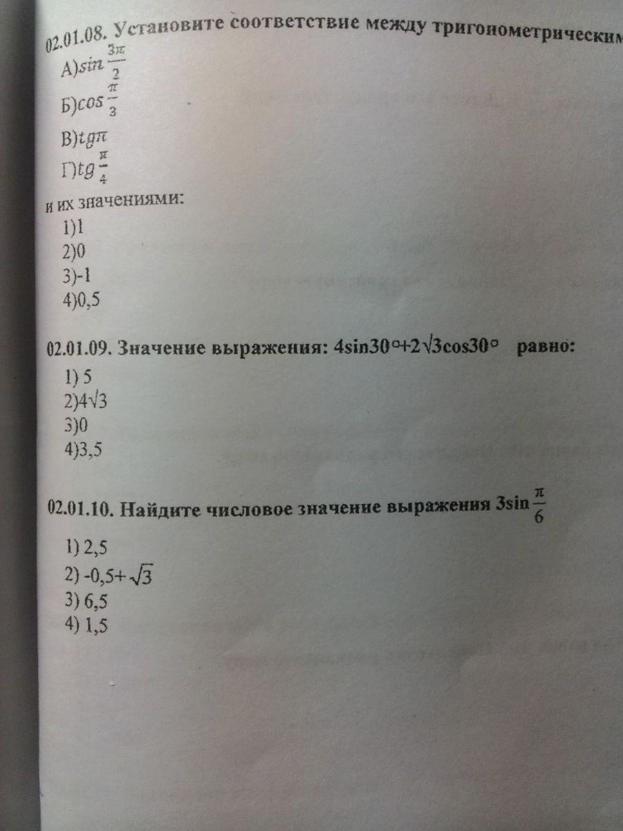 №9. Зная, что синус 30 градусов= 1/2, а косинус 30 градусов = корень из 3/2, подставляем в выражение: 4*1/2+2 корень из 3 * корень из 3/2=2+3=5
