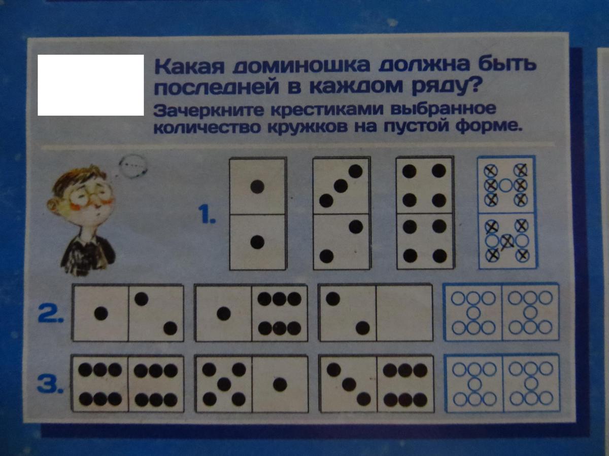 Для 2 и 3 задания: Если принять, что одна половинка доминошки - десятки, вторая - единицы, то 2) зашифрованы числа 12, 16, 20. Разница между ними 4. Значит последним должно быть число 24, т.е. доминошка с двумя и четырьмя точками. 3) Числа 66, 51, 36. Разница между ними 15, значит последнее число 21, т.е. доминошка с одним и двумя кружками. Когда будет известен верный ответ, дайте знать)))