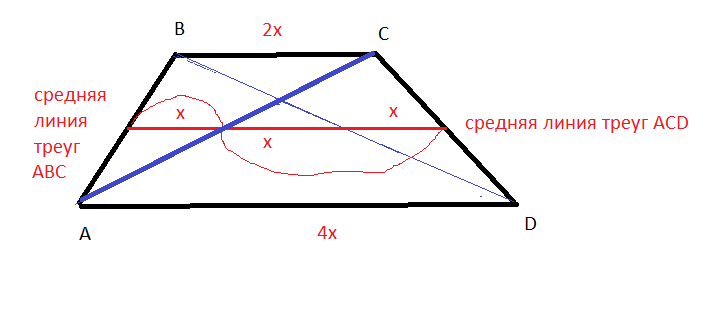 найдите отношение большого основания трапеция к меньшему если диагонали делятся ее среднюю линию на три равные части
