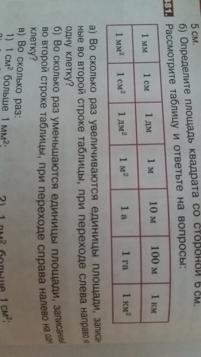 Во сколько раз увеличиваются (уменьшаются) единицы площади записанные во второй строке таблицы, при переходи слева направо (справа налево) на одну клетку?