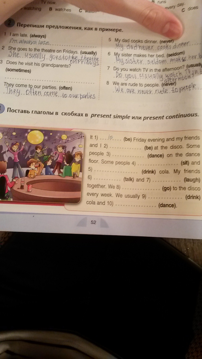 2 - are, 3 - are dancing, 4-are sitting, 5-drinking, 6-are talking and laughing, 8-go,9-drink, dance