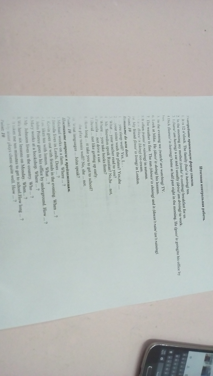 Where does he work? Does she live in Leeds? When does he go out with friends? What does he (she на фото не видно он или она) like? How does he go to his office? Where does she work? Who lives in the country? When do we have 6 lessons? How long does it take you to get to school? How does your sister play chess?