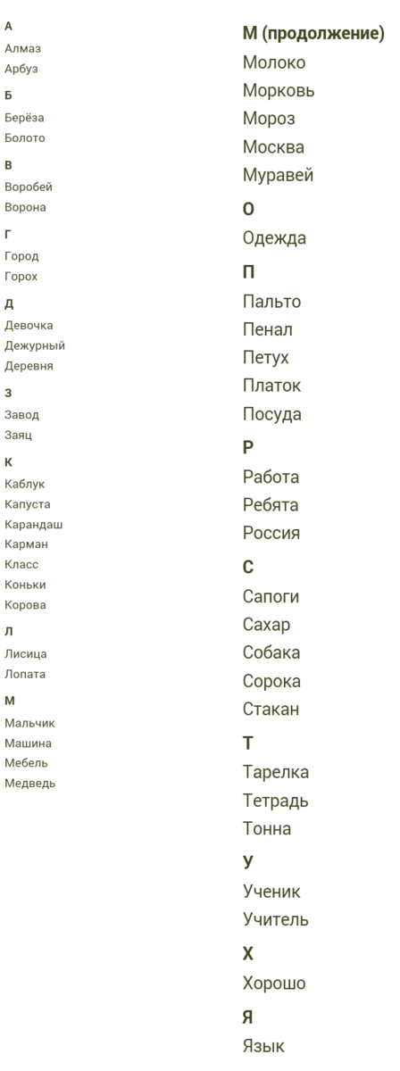 А:АлмазАрбузБ:БерёзаБолотоВ:ВоробейВоронаГ:ГородГорохД:ДевочкаДежурныйДеревняЗ:ЗаводЗаяцК:КаблукКапустаКарандашКарманКлассКонькиКороваЛ:ЛисицаЛопатаМ:МальчикМашинаМебельМедведьМолокоМорковьМорозМоскваМуравейО:ОдеждаП:ПальтоПеналПетухПлатокПосудаР:РаботаРебятаРоссияС:СапогиСахарСобакаСорокаСтаканТ:ТарелкаТетрадьТоннаУ:УченикУчительХ:ХорошоЯ:Язык