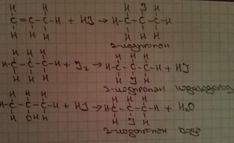 Получить 2-йодпропан тремя способами. Написать уравнения реакций в структурной форме и назвадь продукты реакций.