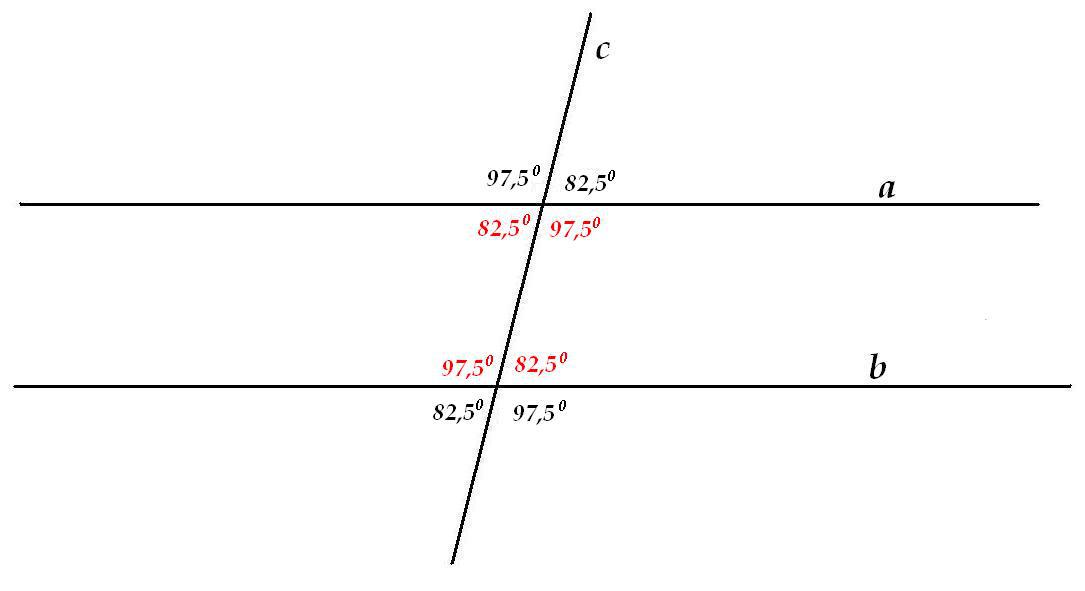 Всё остальное на рисунке. Те углы, которые мы вычисляли (внутренние односторонние) обозначены красным цветом. Остальные находятся через равенство вертикальных, соответственных и накрест лежащих углов.