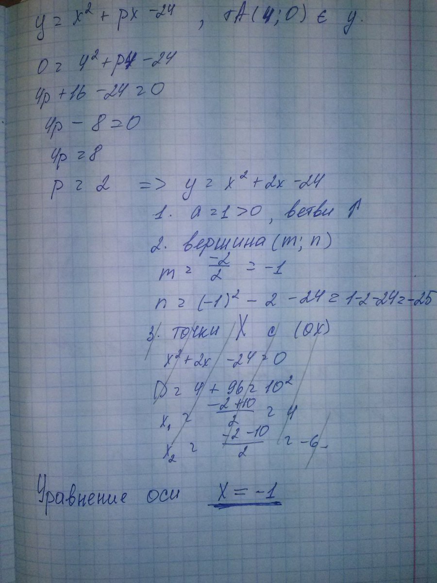 Найдите значение параметра р и напишите уравнение оси симметрии параболы, заданной формулой у=х² + рх - 24, если известно,что точка с координатами (4;0) принадлежит этой параболе