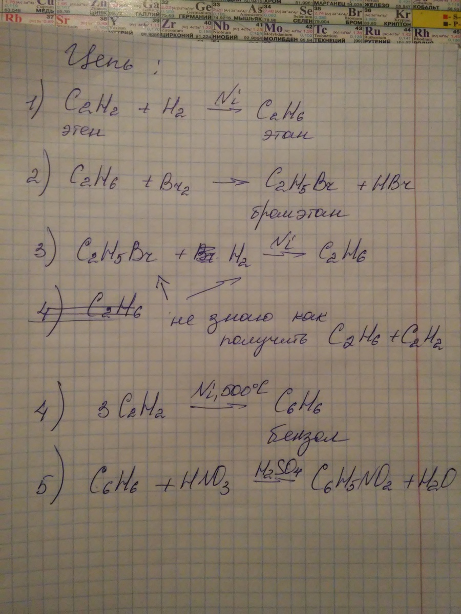 C2H4-->C2H6-->C2H5Br-->C2H6+C2H2-->C6H6-->C6H5+NO2