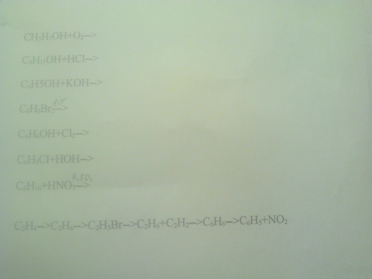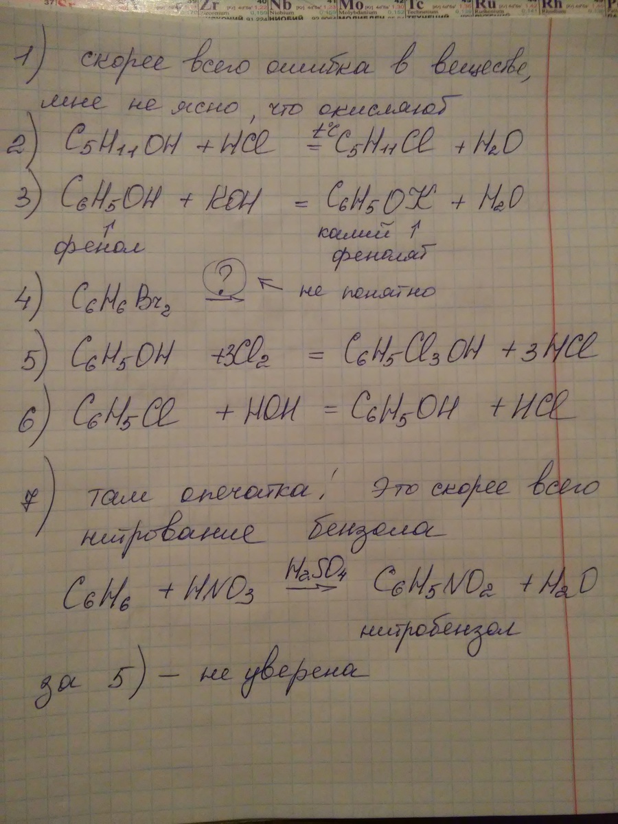 в 7) наверное опечатка,там скорее всего нитрование бензола: C6H6 + HNO3 (над стрелкой указать H2SO4) ➡ C6H5NO2 + H2O