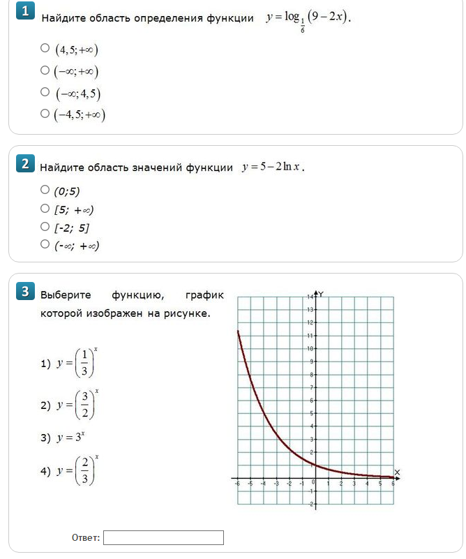 1); ; (-infty ;; 4,5)\\2); ; (-infty ,+infty )\\3); ; y=(frac{2}{3})^{x}