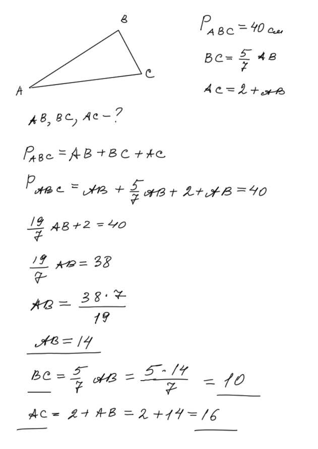 Периметр треугольника ABC равен 40 см.Сторона BC составляет 5/7 стороны AB,а сторона AC на 2 см. больше AB . Найдите стороны треугольника.