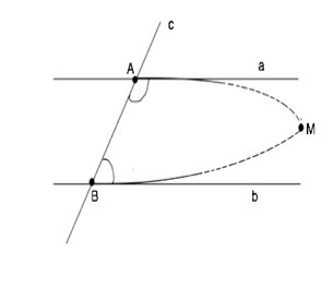 Предположим, что прямые a и b не параллельны и пересекутся в некоторой точке М.