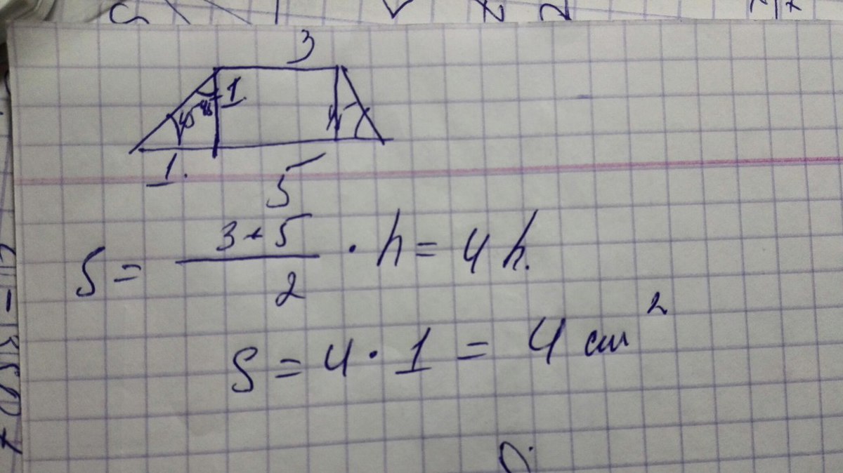 в равнобедренной трапеции основания равны 3 и 5 а один из углов между боковой стороной и основанием равен 45 градусов Найдите площадь трапеции