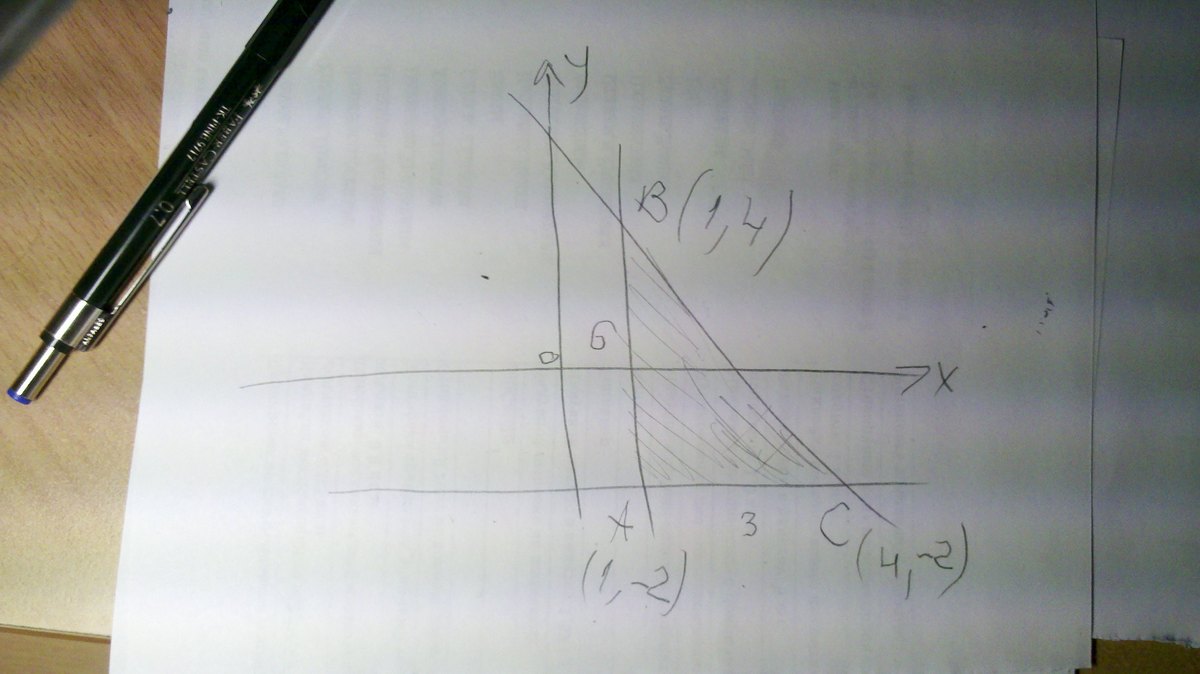 Прямая х=1 и прямая у=-2х+6 пересекаются в точке с координатами х=1 у=-2*1+6+=4, т.е. (1,4) Это будет точка В.