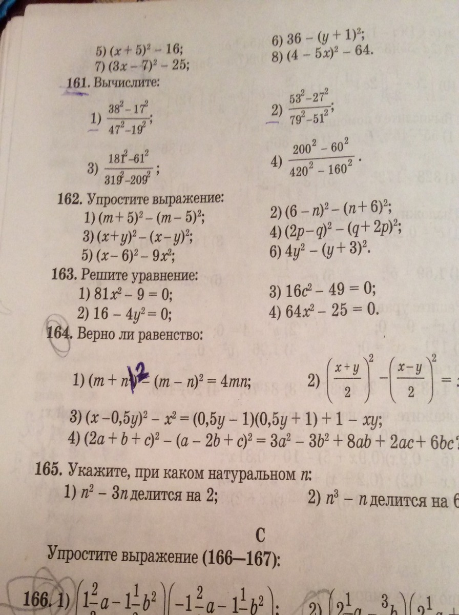 № 162 по формуле a^2- b^2. (m+5)^2-(m-5)^2=(m+5-m+5)*(m+5+m-5)=10*2m=20m Вот и всё решение под буквой а. Остальные выражения можно решить по данной (этой же) формуле.