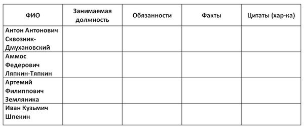 4) Иван Кузьмич Шпекин а) Почтмейстер б)? в) Дела в запустении, читает чужие письма, посылки не доходят в) простодушный до наивности человек, читать чужие письма ПРЕИНТЕРЕСНОЕ ЧТЕНИЕ " смерть люблю узнать, что есть нового на свете ! А таблицу сам заполнишь!