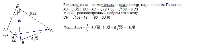 Каждый плоский угол трехгранного угла равен 90. Проведена плоскость, отсекающая на ребрах трехгранного угла, начиная от вершины, отрезки 6, 6 и 6 корней из 2. Найдите площадь образованного сечения. Пожалуйста, помогите!