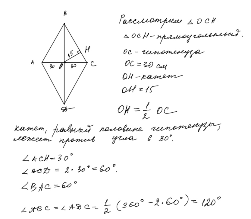 Расстояние от точки пересечения диагоналей ромба до одной из его сторон = 15 см, одна из диагоналей= 60 см. Найти углы ромба.