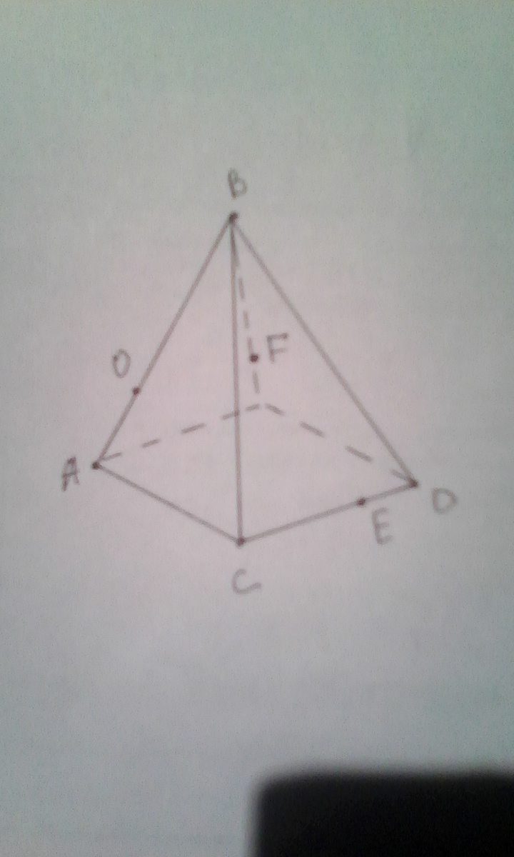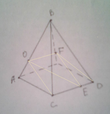 Сечение секущей плоскости пирамиды выделено красным цветом. Это пятиугольник. Хорошо видна вся секущая плоскость треугольника с основанием на желтой линии и вершиной F.