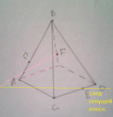 Но если точка расположена чуть ниже, но соединяем Р с точкой О и проводим(две линии розового цвета) до пересечения с соответствующей стороной основания ( на ней находятся проекции точек Р и О (проекции я не рисовала, но если соединить вершину В с точкой Р и продолжить до пересечения со стороной основания, то вы увидите проекцию точки Р.) Точка пересечения розовых линий принадлежит СЛЕДУ, который получается при пересечении секущей плоскости с плоскостью основания.