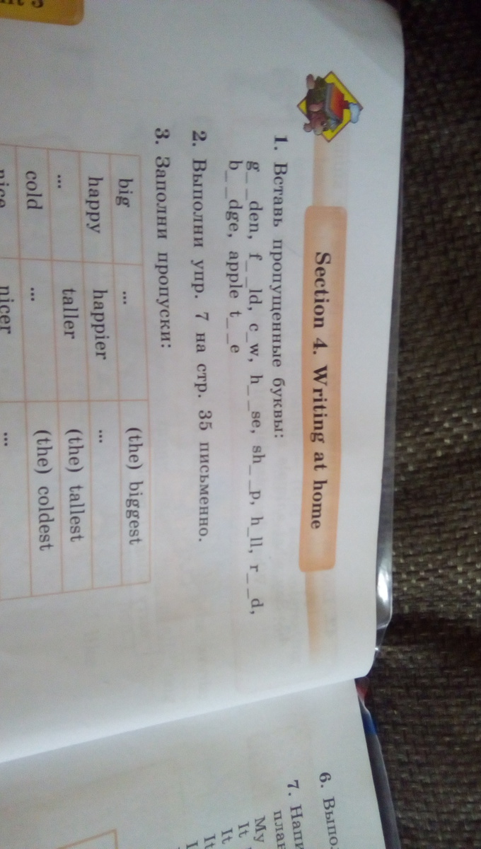 Garden, field, cow, house (horse, если имеется в виду животное), sh__, hill, road, bridge, apple t__e.