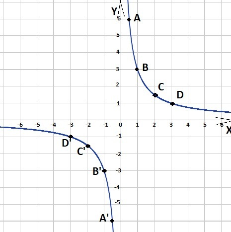 x = -1/2; y = 3/(-1/2) = -6; A'(-1/2; -6)