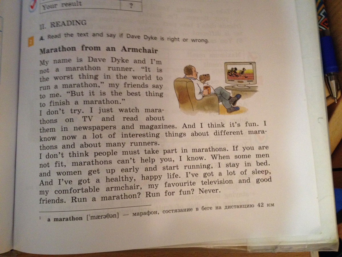 Я не думаю что люди обязаны принимать участие в марафонах. Если ты не подтянут, марафон тебе не поможет. Я это знаю. Когда мужчины или женщины рано встают и бегают, я валяюсь в кровати. И у меня здоровая, счастливая жизнь. Я много сплю, у меня собственное кресло, телевидение и хорошие друзья. Бежать марафон? Бежать для веселья? Никогда!