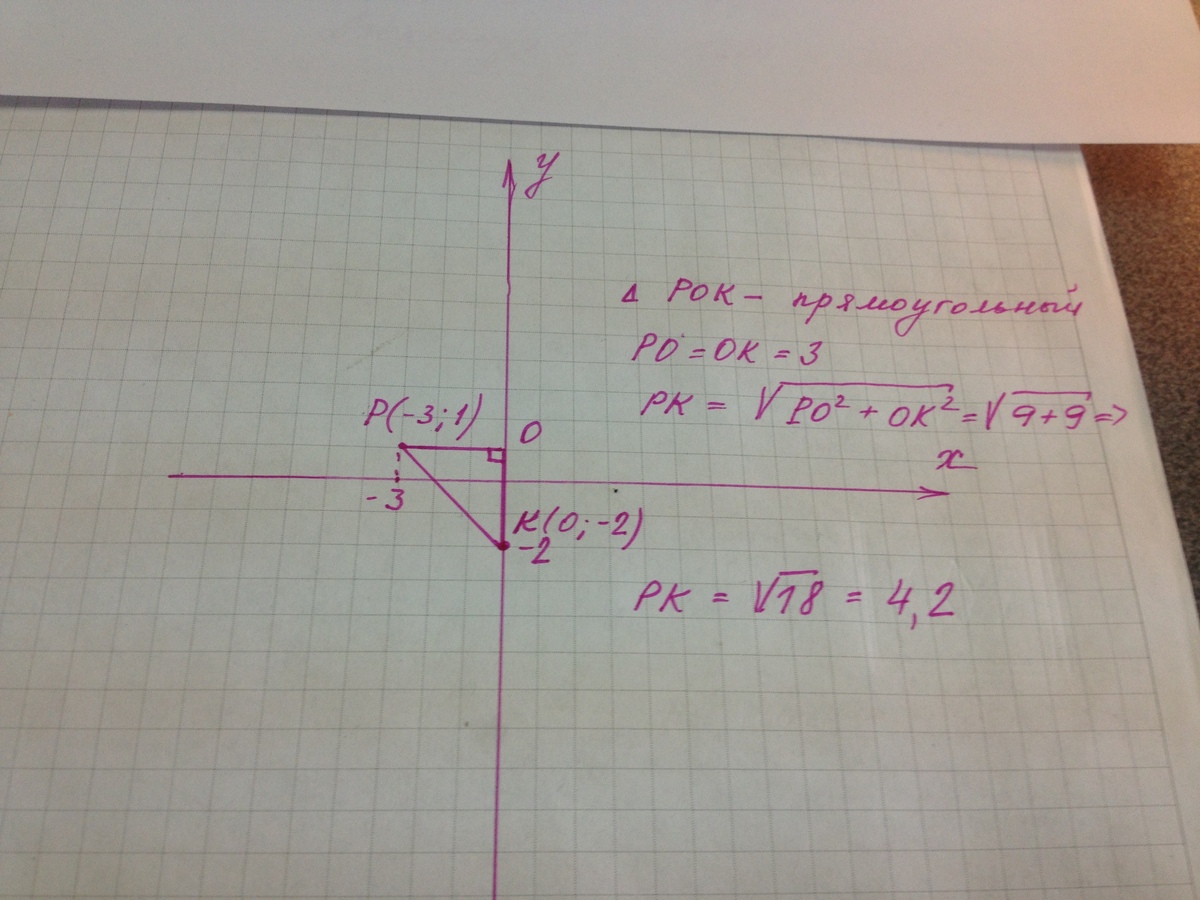 КР^2=РО^2+КО^2, РО=КО=3 (из построения координаты точки О (1;0))