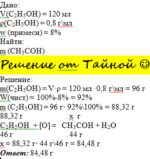 При окислении 120 мл этанола (плотность 0,8 г/мл) с массовой долей примесей 8% образовался ацетальдегид. Вычислите количество вещества образовавшегося ацетальдегида.