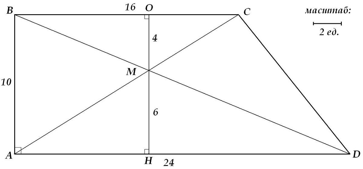 В прямоугольной трапеции АВСД( угол ВАД=90) с основанием АД=24 и ВС=16 диагонали пересекаются в точке М, АВ=10