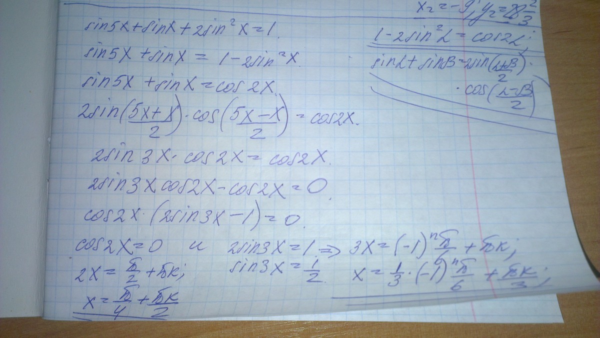 2sin(3x)*cos(2x) + 2*(1-cos(2x) )/2 =1, 2sin(3x)*cos(2x) + 1- cos(2x)=1, cos(2x)*(2sin(3x) - 1)=0, cos(2x)=0 или 2sin(3x) - 1=0, 2x=n/2+nl, x=n/4+nl/2. sin(3x)=1/2, 3x= (-1)^m*n/6+nm, x= (-1)^m*n/18+nm/3. n - это число пи, l,m,принадлежат Z.