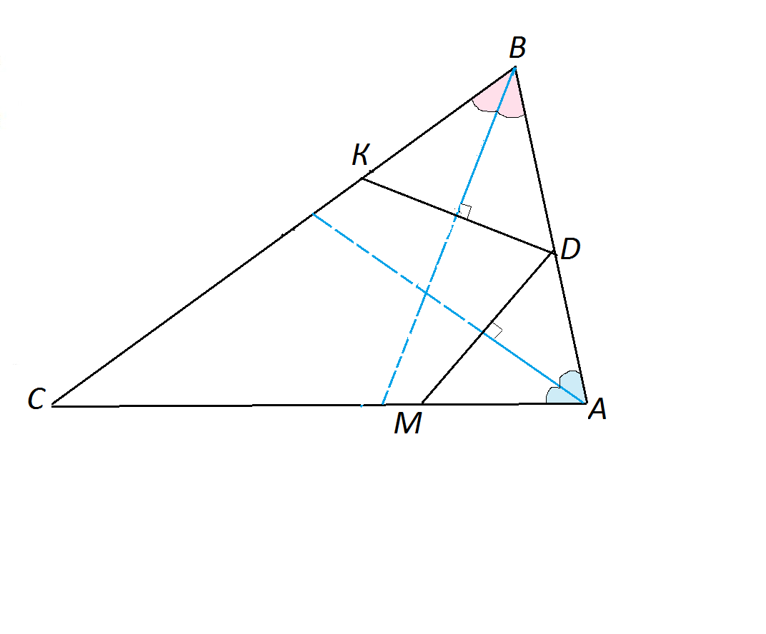 Через середину D стороны AB треугольника ABC проведены прямые перпендикулярные биссектрисам углов ABC и BAC .Эти прямые пересекают стороны AC и BC в точках M и K соответственно . Докажите , что AM=BK